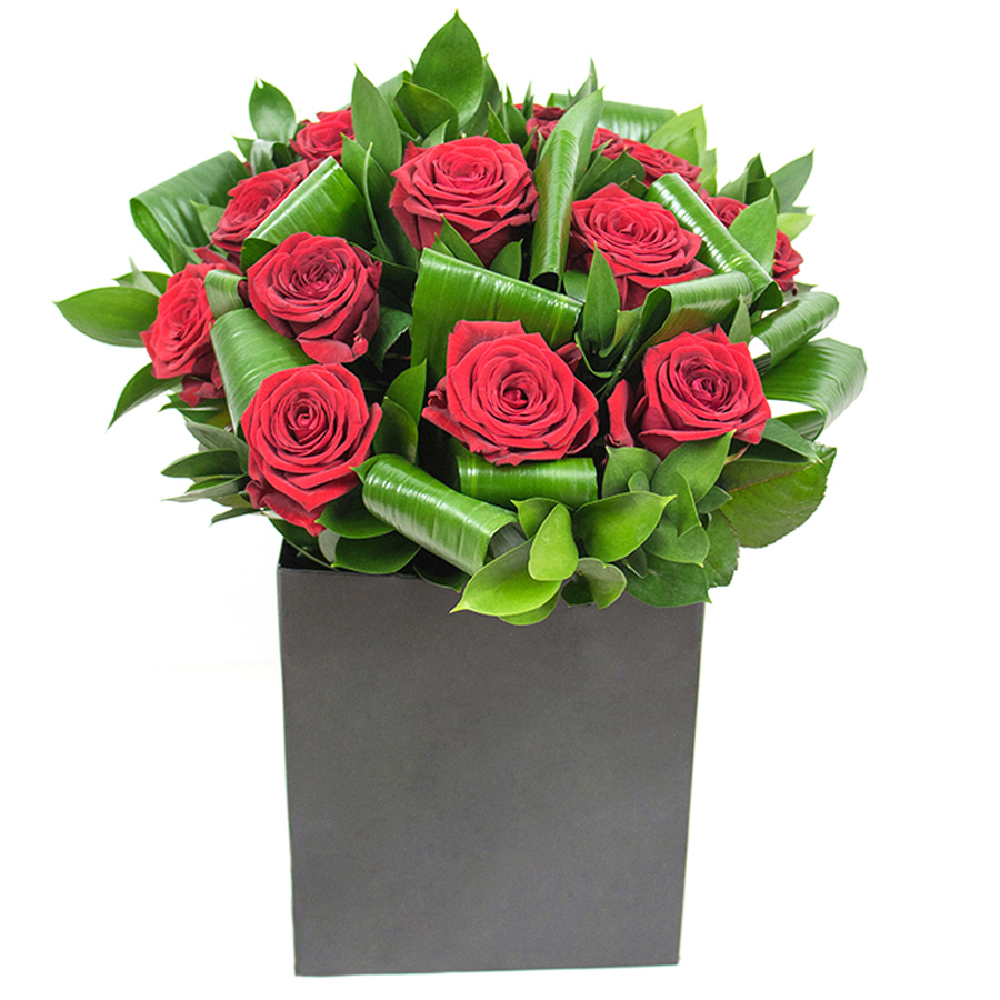 Brighten any room with our radiant red rose bouquet, featuring vibrant red roses, lush aspidistra leaves, and elegant ruscus. This unique floral arrangement brings beauty and distinction to any setting, making it an ideal luxurious gift.
